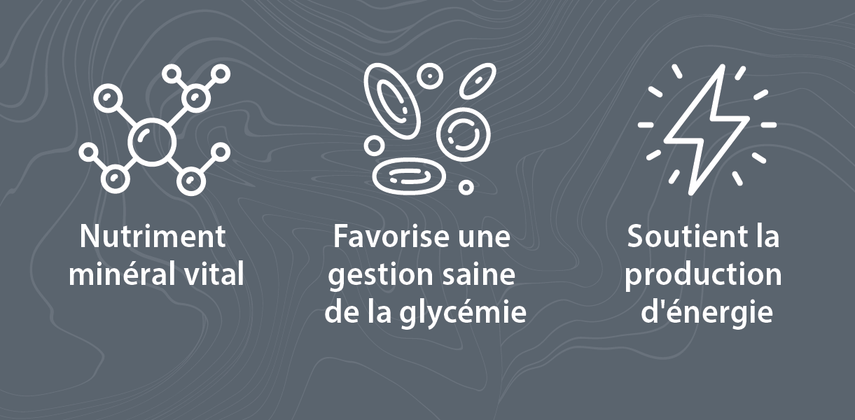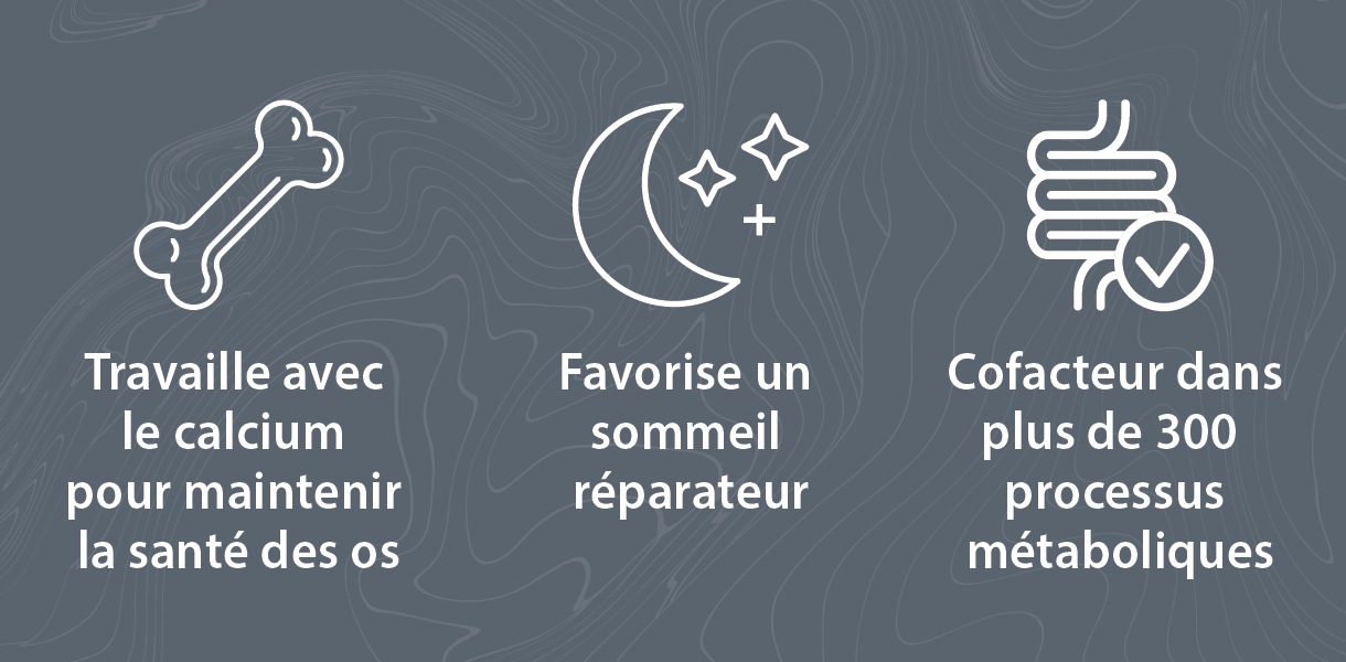 Les avantages de la prise de magnésium sont larges et variés. Cet important minéral nutritif est un cofacteur dans plus de 300 réactions métaboliques et nos systèmes immunitaire, cardiovasculaire et nerveux ont tous besoin de magnésium pour fonctionner normalement. Comme le calcium, le magnésium se trouve en abondance dans le corps humain et est essentiel à notre santé et à notre bien-être. Bien que le magnésium soit abondant dans notre corps avec une alimentation saine, des recherches récentes ont montré que la carence en magnésium devient de plus en plus fréquente. On estime que plus de 40 % de la population canadienne ne satisfait pas aux aux apports quotidiens recommandés (RDI) en magnésium établis par Santé Canada.